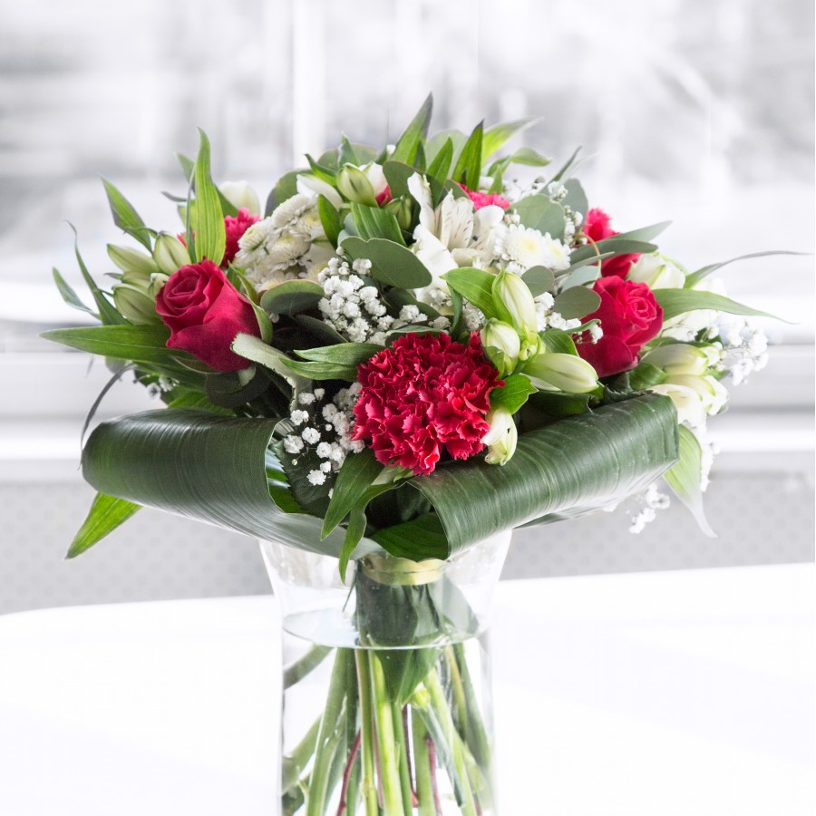 Our Radiant Splendor Bouquet embodies elegance and charm with a blend of vivid red roses, crisp white chrysanthemums, and delicate gypsophila. Complemented by white alstroemeria and rich aspidistra leaves, this arrangement is designed to inspire and delight. Each flower is hand-selected to ensure peak freshness and longevity.